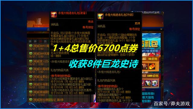 为什么说永恒大陆礼包是“最强礼包”呢?咱们先来看礼包拥有道具,88点券的装备礼包中,内含8件巨龙传说套,1888点券(可用代币券购买)的升级礼包中,可将2件传说巨龙升级为史诗,最多可购买4次,也就是刚好升级8件巨龙史诗!