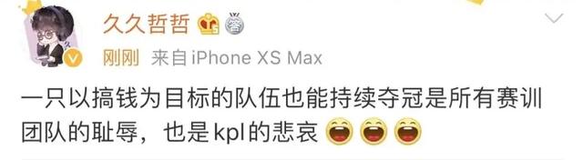 在TS两连冠之后,久哲曾发博表示:一支以搞钱为目标的队伍,也能持续夺冠是所有赛训团队的耻辱,也是KPL的悲哀。刚开始很多人以为久哲这是嘲讽TS,但是仔细读久哲这一句话就会发现,久哲并没有嘲讽TS,他吐槽的是其他KPL战队的赛训组不作为。