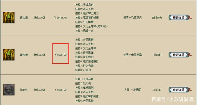 当然很多朋友会好奇它的价格,如图所示:这种黄金兽目前标价6000多,而且还是在四年以上的老牌服务器。那么它到底是价格虚高还是物有所值,小苏在这里寄给大伙儿简单分析下。首先一套5星满级的“大圣附身”最起码就得2500以上,另外修炼灵犀也需要不少的花费,在此基础上还有技能栏的成本。很多人觉得或许是他运气好,自己启灵之后就直接开启了,但是并不等于人家的身价就会降低。不相信的小伙伴可以自己尝试一下使用聚魄丹顶格子,就知道到底有多坑了!另外再加上黄金兽本身的成本,所以玩家自然而然的就把心理价位放在这个水平上了。