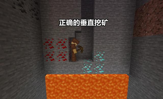 垂直挖矿是挖矿的一大方式,也被称作“猛男挖矿法”。为什么这么说呢?因为时常有上一秒天堂下一秒地狱的情况,一失足就掉进岩浆中了。但其实垂直挖矿并没有这么可怕,只是你没有掌握方法而已。就像上图一样,下面即便是岩浆滚滚,但玩家垂直挖矿挖了两格,即便挖钻石自己也不会掉进岩浆,最多也就损失一颗钻石而已。