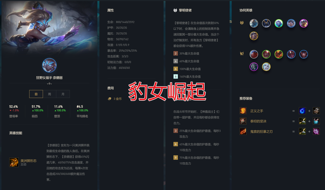 另外一点在于豹女这个英雄在游戏中拥有两个形态,一个是远程输出另外一个则是近战输出,而在上个赛季则不是。当豹女进入到近战输出状态的时候会增加该英雄的输出能力并且增加了攻速,如果当豹女达到三星的时候可以增加75%的攻速接近翻倍,并且在第四次攻击的时候还会触发魔法伤害,有这些特性的加持,如果豹女培养成型了还会输吗?