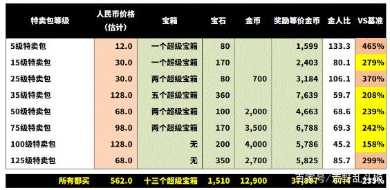 首先当然是默认的金币和宝石的比率,这种随时充钱随时花的不限时不限购商品是金人比最低的,这没什么说的,尤其是首次充值拿过赠送的奖励之后,再充值去买这些东西就更亏了。