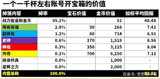 这里面存在一个问题,就是宝箱会出英雄,荒姐玩到现在一个传奇没有,脸黑的过分,我们用商店出售英雄的价格80宝石左右折算金人比,可以得出实际上我们要开出88.5个金币左右价值的道具才不亏。