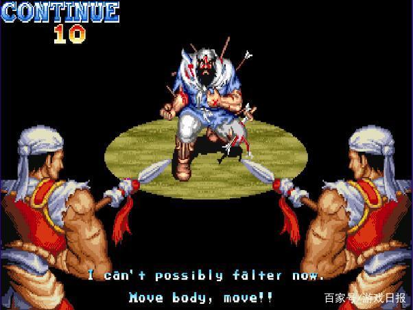 二、 主角卖惨型除嚣张的BOSS外,主角也会使出“浑身解数”来吸引玩家投币。例如《三国志》系列里,如果玩家死亡,就会触发“战败”动画。主角身负重伤单膝跪地,并且嘴里还说“我现在还不能退缩,快动啊我的身体,动!”营造出一种“不甘心”的气氛。