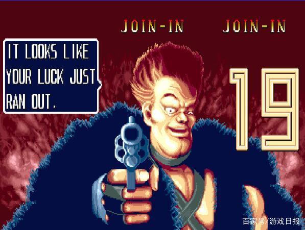 横版过关游戏大多都一样:玩家作为正义的一方,与邪恶敌人战斗拯救世界。这一类游戏惯用的续币手法,便是让BOSS尽可能的“嚣张”。例如《恐龙快打》里如果玩家死亡,续币画面会出现第一关的BOSS特休恩,他手持左轮指着玩家嚣张的说:“你的运气似乎用完了”。