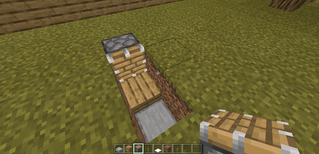 铺好了之后呢,进入第一格底部,面朝活塞,在面前的格子上随便铺一个正常方块,接着在活塞方块上安放一个拉杆,我们的准备工作就完成啦。