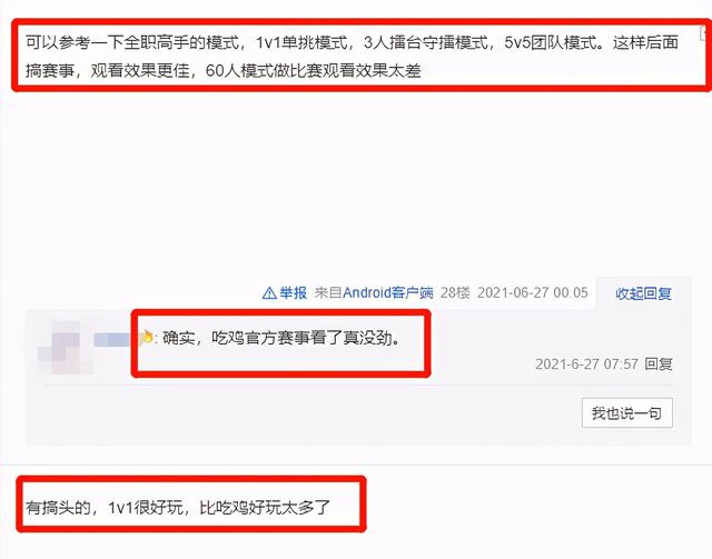 如此一来,这款游戏就不仅仅是一款大逃杀游戏了,还可以变成一种对于单人实力考验的游戏。网友提议,一场比赛可以邀请16位玩家,分成8组进行1v1的对决,最终赢下来并且走到最后的人,可以参加决战,而在最终的对决中赢了下来,就相当于吃鸡了。这样的玩法,或许也会成为众多小伙伴喜欢的类型。