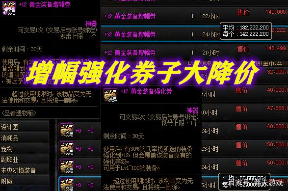 【12强化券/增幅券】:除了上面2种特色道具外,拍卖行中还出售各种“概率性强化/增幅券”,比如12黄金强化券3000多万,12黄金增幅券1.3亿金币左右,同样是赌脸的操作,欧皇玩家可以考虑。