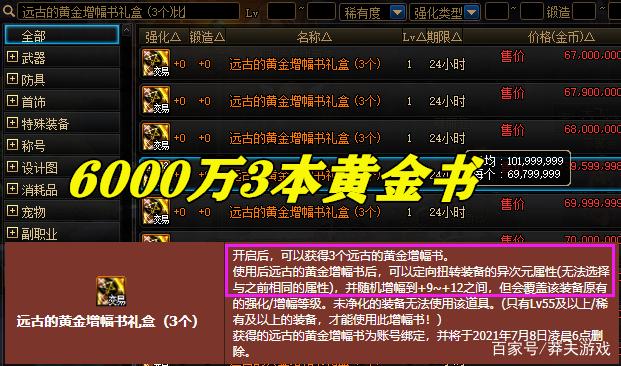 【远古的黄金书礼盒*3】:打开之后可以拿到3本远古黄金书,黄金书增幅等级在9~12之间随机。商城魔盒最重磅的道具之一,周年庆前售价1个亿以上,周年庆后仅需6000多万(还在持续降价中),降价幅度接近5折了,由此可见,出售黄金书的玩家实在太多,当然也有玩家不想增幅的因素在其中。