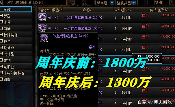【一次性增幅器礼盒*30】:打开之后可以得到30个增幅器,周年庆前售价1800万,周年庆后售价1300万,降价幅度近500万。30个增幅器说多不多,说少也不少,比较适合用来增幅红7以上的装备,比拍卖行购买矛盾结晶还是更划算的。