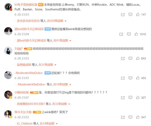 夏季赛开始,IG前几场比赛都是Wink加Lucas的下路组合,揭幕战上IG战胜了SN,但是后面Wink表现越来越低迷,于是IG换上Puff与Baolan的下路双人组。Puff登场的第一局比赛就使用厄斐琉斯斩获五杀,让粉丝欣喜若狂,大家都以为IG将会在后续比赛确定下路双人组首发阵容。然而在输给LNG后,IG却让人惊喜地再次更换下路首发双人组,引得众人不满。IG官博下都是粉丝的不满留言,“还能看到Wink上场我是没想到的”,“还轮换?你有病吧”,“打不过LNG是下路组的问题?”粉丝都在为Puff与Baolan再次替补而感到不满。