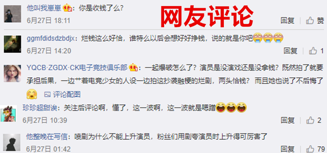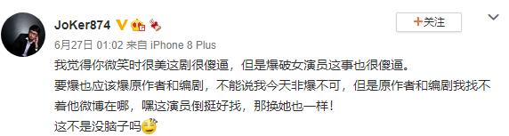 对于Joker公然支持程潇这一发言也是引发了网友们的热议,许多网友都表示剧是烂剧那为什么演员要接呢?竟然拍了就要承担后果,设立电竞少女的人设就还拍这种融梗剧想两头恰钱就应该被喷。也有网友质疑Joker是不是恰烂钱了帮忙洗白,这波帮忙说话又是涨了不少粉丝了,因为Joker的微博是设置了关注了才能评论。