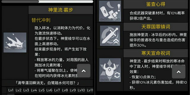 结合测试服数据,可以了解到神里绫华其实是一个元素伤害覆盖率极高的近战。在伤害组成中普通攻击和重击伤害占比较高,而撑起这样覆盖率的亮点机制则是大小姐的冲刺技能——神里流-霰步,类似莫娜的冲刺机制。这个技能与辅助天赋寒天宣命祝词相辅相成,近期在测试服中寒天宣命祝词还也得到了加强,由冲刺后弹起获得10%伤害加成提高到18%,那么根据这个天赋技能可以进行以下两种配队。