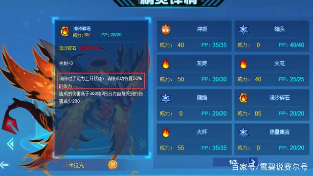 对手处于异常状态则伤害提高100%,这个效果明显配合魂印烧伤来用,在对手进入烧伤后就能拿到不错的增伤效果;击败对手令对手下只精灵随机进入一种异常,这效果太看天了,就一个天意控基本打出来就是个烧伤啥的,顶多配合第五增伤继续推。