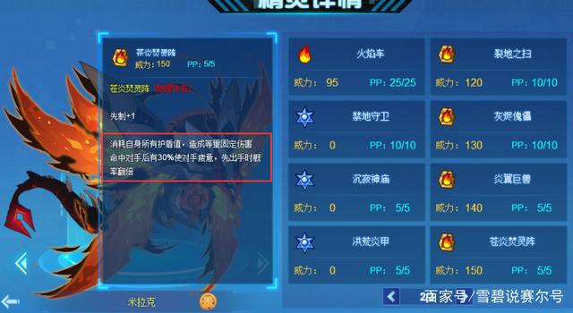 苍炎焚灵阵(大招)低劣的混地劣化技能,消耗自身护盾来造成固伤的效果,同样的效果混地的魂印和技能都是围绕这个消耗护盾机制的,混地开强化拿盾配合魂印加盾就能消耗盾带来大量固伤,而这个精灵本身盾全靠魂印,而魂印的盾又不是常驻的,这就导致粉伤机制设计的很烂,需要站场拿盾再进行后续输出。