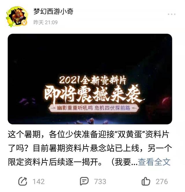 时间过得可真快,一眨眼的功夫,2021已经过去大半,年初定下的小目标实现了没有?打住,放下这些让人郁闷的话题,让我们看看梦幻中发生了什么趣事吧!提到“小奇”,估计大家都不陌生,作为梦幻的策划,他总会爆料一些“新内容”。就在昨天晚上,小奇发布了一条动态,点进去一看,原来是暑假的新资料片,其中“双黄蛋”更是成为了大家关注的焦点。
