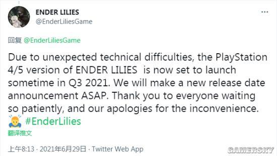 由于意外的技术问题,PS4/5版本的《终焉之莉莉:骑士寂夜》现在定于2021年第三季度的某个时间推出。我们将尽快公布新的发售日期。感谢大家的耐心等待,给您带来的不便,我们深表歉意。