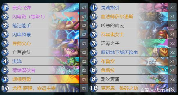 这套卡组对于快攻的抗性是很不错的,解场手段特别多。前期有闪电风暴、闪电链以及衰变飞弹。同时这些解场法术还可以配合笔记能手返场,由于我们有瓦丝琪女士、血法师萨尔诺斯这样的法强随从。即使闪电链还没有升级,都是可以凭借法强来处理对手的场面的。使用完AOE法术之后,下个回合还能拿洪流继续解对手刚下的随从。