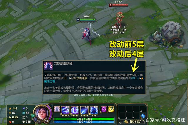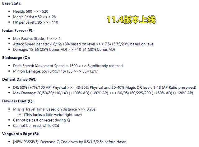 最后总结一下:生命值和魔抗减少,成长生命值提高;Q技能速度降低,对小兵伤害提高;W双伤减免回归,伤害提高;E技能弹道统一,不能联动Q的改动回调;R技能新增被动。改动后的刀妹更能让普通玩家接受,这也是拳头一贯的作风,为的就是出场率和平衡胜率。