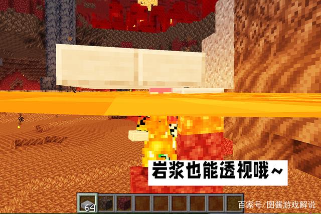 其实不仅是墙壁,利用该方法也能透视岩浆下方的地形,据玩家统计,岩浆下方出现钻石或者远古残骸的几率很高,只是大部分情况下由于岩浆的阻挡导致玩家无法发现罢了,具体方法也很简单,在岩浆上面放置上半砖,然后站在半砖下方以第三人称视角查看即可。