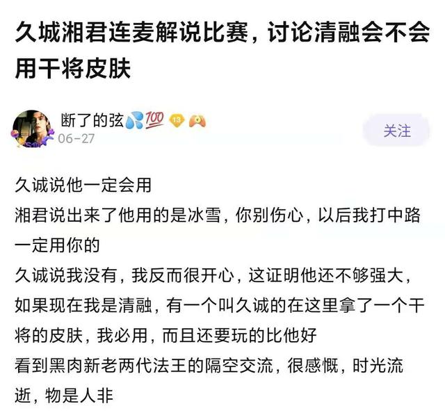 当时久诚在和TES湘军连麦解说,看到干将莫邪的时候自然也就打起了精神,毕竟这个英雄是他的招牌,也拥有干将莫邪的FMVP皮肤。他本来想着清融会用久胜战神皮肤,但结果清融选择的是冰雪皮肤,湘军还在和久诚开玩笑,说以后自己打中单了一定用久胜战神。久诚则表示自己并没有伤心,反而有点开心,这说明清融的内心还不够强大。如果自己是清融的话,肯定要用久胜战神这个皮肤,并且还要比久诚玩得更好,证明自己的实力。