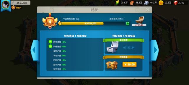 玩家每天可以领取特权点数,用来升级特权等级,这个等级的提升可以加速城池中农业工业的生产速度,这样玩家就可以在短时间产出更多的资源,而且还可以加速采集资源的速度等等,这个玩家是可以白嫖,所以对新手玩家真的是太友好了,你们每天都领取了吗?