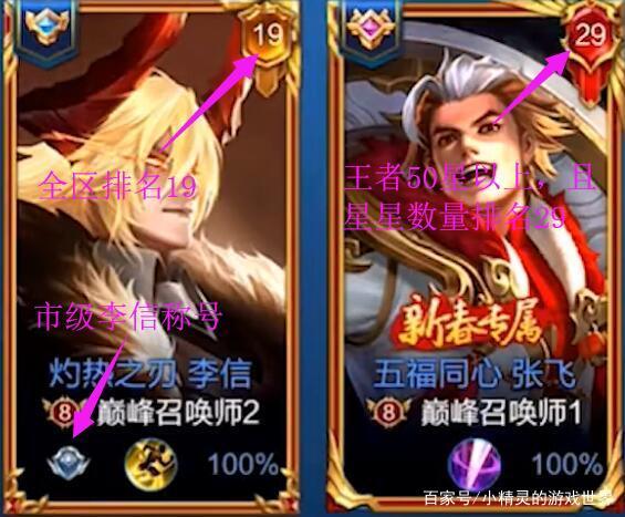 李信玩家右上角金黄色的标志代表着他的全区排名是19,这个也意味着,这名玩家的游戏水平非常高了,而李信左下角的银色标志则代表着,这名玩家的李信排名是市级称号。而张飞玩家右上角红色牌子内的29则表示,他不仅是一名荣耀王者玩家,而且他星星的数量也达到了排名29的位置。