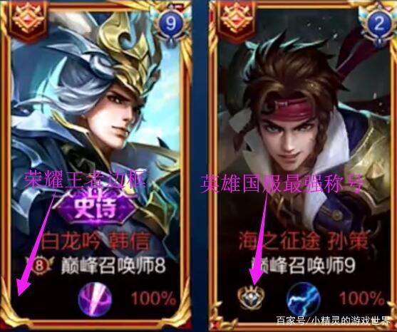 韩信和孙策一对比,从右上角我们不能判定谁的段位比较高,但从左下角我们就可以看出,韩信的段位是荣耀王者,而孙策的段位则是王者0-49星之间。而他们右上角的数字代表的是他们巅峰赛的排名,同时孙策左下角的图标是国服称号,这也就是说,这名玩家的孙策有国服排名。