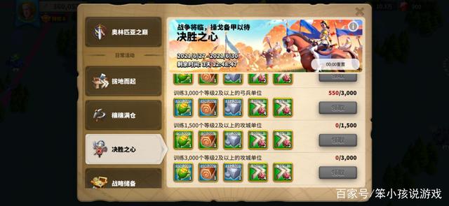 该活动是针对训练部队量的鼓励活动,我们每天进行部队训练数量达到一定数量时就可以获得奖励,主要涉及四种部队,分别是步兵、骑兵、弓兵以及攻城单位,而奖励主要是高额的资源包奖励,基本上都是十几万奖励,在我们训练部队提升战斗力的同时,还可以获得丰富的资源。