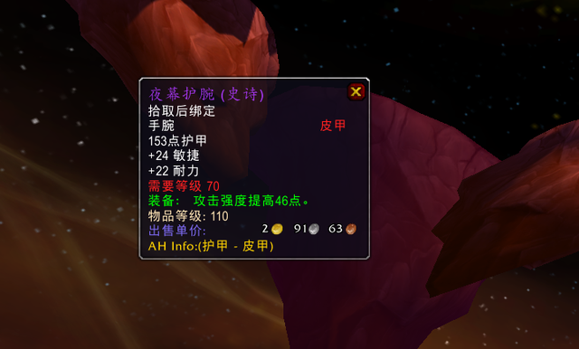 夜幕护腕掉落于时光之穴敦霍尔德的BOSS时空猎手,掉落25%。这件护腕就是简单粗暴的高敏捷高攻强,而且掉率超高,建议优先入手。