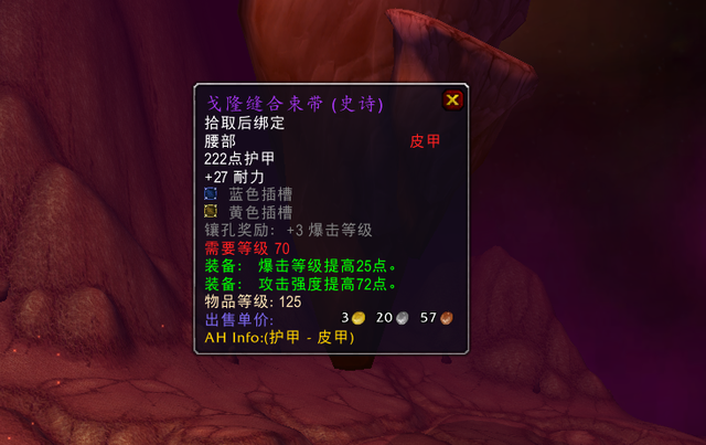 这件皮甲腰带掉落于屠龙者格鲁尔,掉率14%。戈隆缝合束带虽然没有主属性,但是双孔可以插敏捷宝石,更重要的是提供了高达26点暴击等级和72点攻强,这个属性在P2都没有替代品。