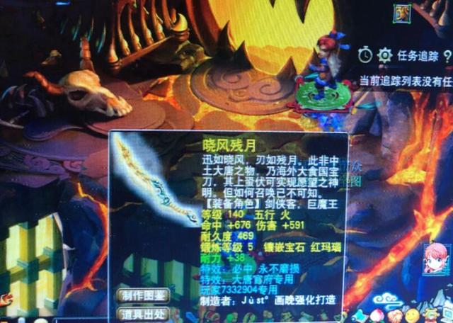 上面是140级专用的武器,这把140级的专用武器的伤害属性是591,已经突破了系统的非专用伤害属性上限,而且还拥有着永不磨损和必中双蓝字效果,所以上面这把武器的拥有者在159级可以打PK,也可以去打宝图,而且平刷任务的时候平砍挂机也不用担心自己秒不到怪物,上面的这把武器就相当于大唐官府的神器。