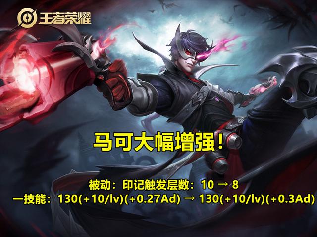 其次,本次更新还对正式服内,马可尴尬的强度进行了修正,改版后不仅是法球特效流消失,由于马可暴击属性的伤害加成,暴击流马可同样胜率垫底,因此针对这点对马可的1技能AD加成数值以及被动叠层门槛分别进行了增强,其中原本10层打出真伤效果的被动降低为8层,也就是说马可的作战能力再度提速,依然是一把末世+攻速鞋即可参团!