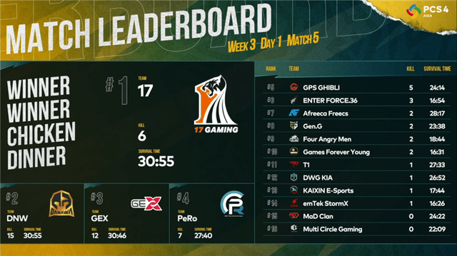 不过在本周的首日17战队终于站起来了,当天命圈给到他们的时候,他们终于把握住了机会,先是完美地清理掉了前来撞房的T1两人,随后又靠着稳扎稳打的方式,在决赛圈有惊无险地拿下一鸡,就是这一鸡让17战队减少了不少的压力,毕竟接下来只有6场比赛了,如果36局比赛一鸡不吃,那国内的PUBG圈又会给他们造出一个名梗,本来心态就不好的17战队估计要崩溃。