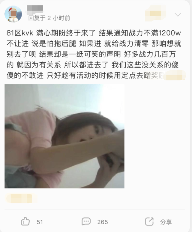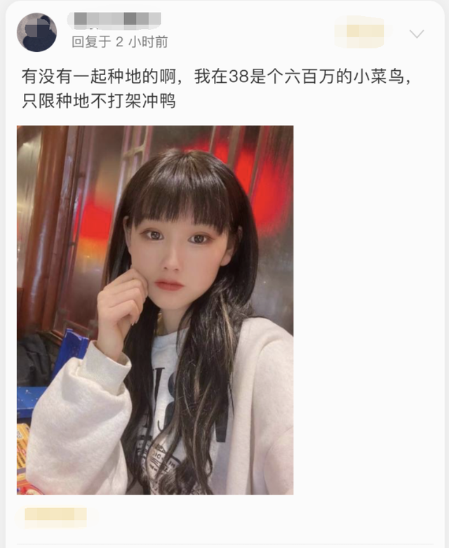 微氪金一下的玩家,在游戏里好过吗?看看评论区里的玩家,大多都想找个和谐区域,养老种地。这晒出美女照片的玩家,表示600万的菜鸟,只想种地不打架,寻求大佬们的保护。如果女玩家不爆照,相信没有几个人会回复评论。