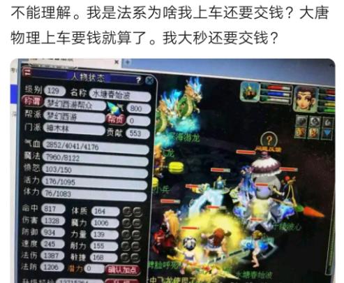 上面是一位129级法系门派的玩家,上面这位129级法系门派的玩家表示,大唐物理系等门派上车要车费就罢了,为什么他法系上车还要交钱?其实在收车费这方面物理系、法系、辅助派没有任何的区代,大家之所以不想要物理系是因为物理系的攻击时间太慢,比较浪费时间,而且小编感觉上面的这位法系玩家也没有资格提出这样的要求,因为上面这位129级法系的玩家速度太慢了,129级速度只有245,这样的速度属性估计怪物都出手了这位玩家还没出手呢。