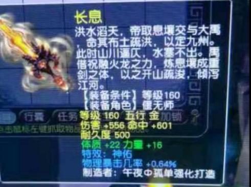 上面是160级的长息,这把武器如果只看蓝字效果,她是可以给PK流派的玩家使用的,因为他拥有的神佑和0.64%的物理暴击几率,狮驼岭,花果山等物理系门派很喜欢这样的武器,但是看到这把武器伤害时大家又发现这把武器就是一把任务流派的武器,她的伤害属性只有556,而且双加属性增加的还比较少,现在这样的蓝字效果就只有锦上添花的作用了,让任务流派的玩家在任务中能够打出更耀眼数据。