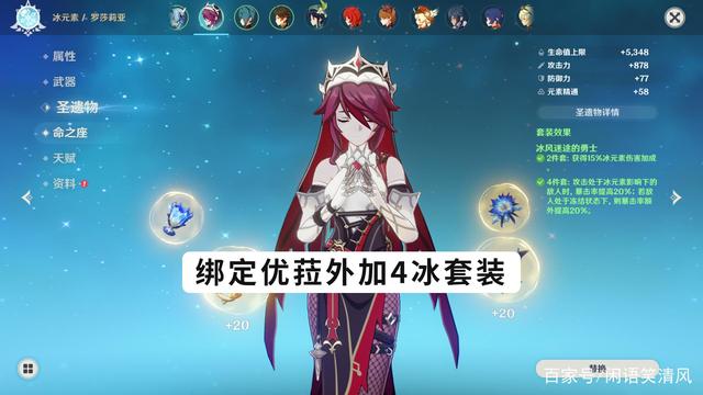 班尼特在辅助中的地位是独一档的,而罗莎莉亚虽说比不上,但是在某种程度上,作用也同样不小。比如说配合优菈组成双冰,给优菈当充能宝,技能丝滑度瞬间就会提升一个档次,不过我自己是真的没有怎么出,一个都不来,很难受。罗莎莉亚的二命对角色提升很大,六命对优菈提升更大,总之,我个人感觉罗莎莉亚的配队尽可能是绑定优菈,没有优菈的话建议就不练了,圣遗物冰系4件套加西风长枪就不错,至于给优菈充能的效果,只能说是用过的都说好。