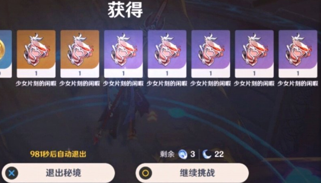 少女闲暇一整天!最后则是某位玩家的少女套出货记录,虽然五星圣遗物没有上面几个多,但是这位玩家一次性出了八个【少女的片刻闲暇】。这个数量看起来这位玩家真的非常受少女喜爱,估计也是其他的圣遗物一个没出。甚至都让人怀疑这是不是这套圣遗物的专属副本,只会出这一种圣遗物的一个部位。本来是少女的片刻闲暇,现在看来少女估计要闲暇个一整天了。都说贪生怕死角斗士,勇往直前少女心。不知道这里面有几个勇往直前的少女,不过奶妈现在版本其实作用不明显,所以这八个圣遗物估计这位玩家也不想出。