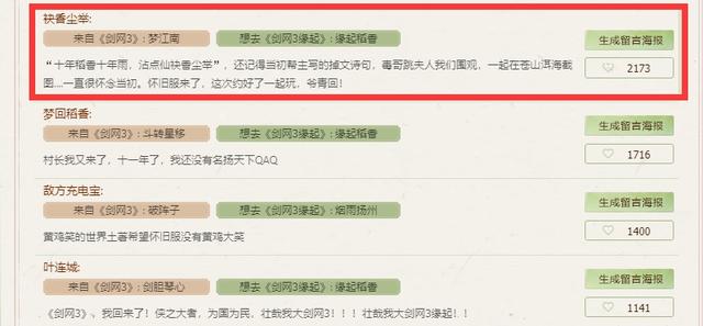 看完郭大侠的留言后,132万老玩家也纷纷效仿,留下了浓墨重彩的一笔,其中有一位玩家写给剑网3的留言,收获了2173个点赞,内容是【十年稻香十年雨,沾点仙珏香尘举,还记得当初帮主写的诗句,毒哥跳夫人我们围观,一起在苍山洱海截图,一直很怀念当初,怀旧服来了,这次约好了一起玩,爷青回】看完真的是满满的回忆,难怪能收获2173个点赞。还有玩家一句【村长我又来了,十一年了,我还没有名扬天下】道出了多少人的心声。
