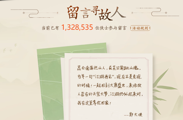 剑网3缘起即剑网3怀旧服,既然是怀旧,难免少不了情怀,老友重逢,重游大唐,再次体验游戏剧情等等,在正式公测之前,你有哪些话想要对你曾经的好友说呢?先来看看郭大侠写给剑网3缘起的一段留言【昆仑南屏巡山人,荻花日轮跳山魂,当年一句江湖再见,现在正式兑现的时候,一起回到大唐盛世,来场故人皆在的天宝大梦,江湖仍似你来时,我在这里等你回家】一句“江湖再见”一句“我等你回家”让多少剑网3老玩家潸然泪下。