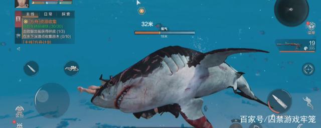 海中的鱼也是“可收集”的对象,我们可以杀鲨鱼获得钱、经验、皮、肉等资源。值得一提的是,这个鲨鱼的模型设计也是让小编觉得很惊艳的地方。鲨鱼的身上有许多的斑驳,现实海洋中的鲨鱼也是如此。作为变异体,身上也有许多明显的特征。