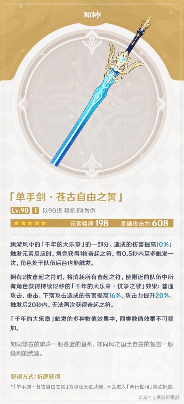 苍古自由之誓∶这把剑是官方定的专属武器,无论是副词条元素精通还是被动给全队角色提高普攻,重击,下落攻击的伤害,都特别适合万叶(尤其适合给魈打辅助(ω))
