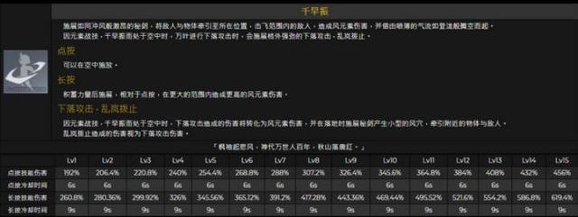 万叶进行范围聚怪,并腾空而起,如果因为e技能而在空中进行下落攻击,则下落攻击转换为风元素伤害,并在地面留下一个风眼牵引周围敌人造成持续风伤,风眼是会被其他元素染色的,染色后造成额外的元素伤害,点按与长按的区别只有技能范围和伤害,与下落攻击及其造成的风眼无关