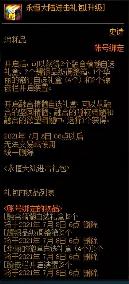 再加上商城上架的永恒大陆进击礼包,可以大大缩短制作功能性史诗装备的周期。88点券的永恒大陆进击礼包[装备],可以直接获得8件自选传说装备,1888点券的永恒大陆进击礼包[升级],可以购买四次,一共可以获得8个升级传说装备的精髓,还有耀银品级调整箱、华丽的徽章自选礼盒、镶嵌栏开启装置等道具。