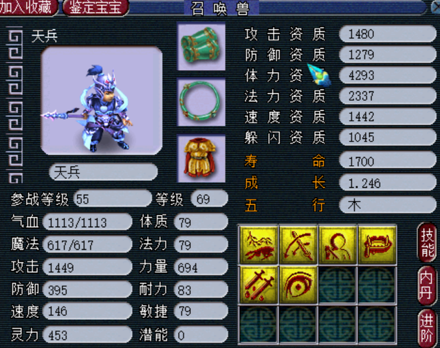 天兵现在看到的其实有点少,光看造型还是挺不错的。淡蓝色的铠甲,整体的样子还是挺威武的,比起原造型是要好看不少。技能就有点太少了,全红是没错,可惜只有6个。速度资质有1442点,这本身就超过了很多同类型的宝宝了。