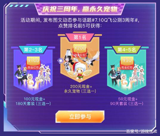 大家别着急,后边还有奖励。这次活动也为了庆祝QQ飞车手游三周年,玩家可以发布图文动态参与话题互动,获得点赞排名前5的玩家,也能拿到现金红包和极品套装和永久宠物的奖励。究竟怎么样才能获得其他玩家的点赞呢?大家可要认真想想了!