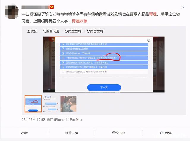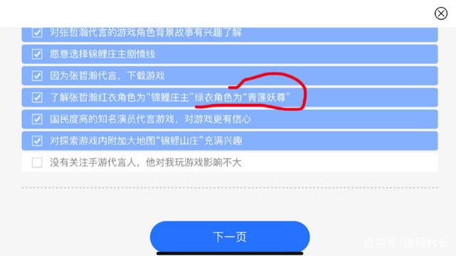 为了让大家对张哲瀚此次代言的造型更直观的了解,6月28日官方在游戏中就给出玩家调查问卷了,只见其中一栏显示:了解张哲瀚红衣角色为“锦鲤庄主”绿衣角色为“青莲妖尊”,看来这次是真的急了。(图@爱神降临倒计时)