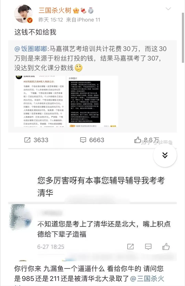 最近,因为一个小爱豆高考失利而闹得沸沸扬扬的事件发酵了很多天,之后一位游戏主播转发了关于“马嘉祺粉丝为给马嘉祺补习,花掉粉丝集资30万元,最后成绩非常不理想”的新闻,并评论“这钱不如给我”,导致在评论区中,有很多粉丝都在讽刺该游戏主播是“九漏鱼”(九年义务教育漏网之鱼),嘲讽该博主不学无术,看不起游戏主播。