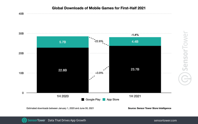 下载量方面,Sensor Tower称,在2021年上半年,全球移动游戏总下载量约为285亿次,同比下滑1.4%。其中,App Store游戏下载量约44亿次,与去年同期的57亿次相比下降了22.8%。Google Play的游戏下载量则继续保持着增长势头,237亿次的下载量较去年同期上升了3.9%。Sensor Tower认为,这很大程度上是因为,在疫情影响依然严重的国家和地区,安卓设备普及率更高。